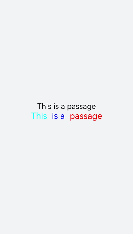 <!-- xxx.hml --><div class="container" style="justify-content: center; align-items: center;flex-direction: column;background-color: #F1F3F5; width: 100%;height: 100%;"><text style="font-size: 45px;">This is a passage</text><text style="font-size: 45px;"><span style="color: aqua;">This </span><span style="color: #F1F3F5;"> 1</span><span style="color: blue;"> is a </span> <span style="color: #F1F3F5;"> 1 </span><span style="color: red;"> passage </span></text></div>