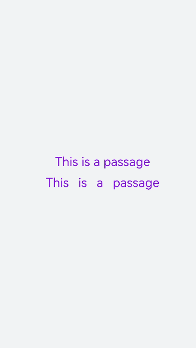 <!-- xxx.hml --><div class="container" style="background-color:#F1F3F5;flex-direction: column;justify-content: center; align-items: center;"><text style="color: blueviolet; font-size: 40px; allow-scale:true">This is a passage</text><text style="color: blueviolet; font-size: 40px; margin-top: 20px; allow-scale:true;word-spacing: 20px;text-align: center">This is a passage</text></div>/* xxx.css */.container {display: flex;width: 100%;height: 100%;flex-direction: column;align-items: center;justify-content: center;background-color: #F1F3F5;}