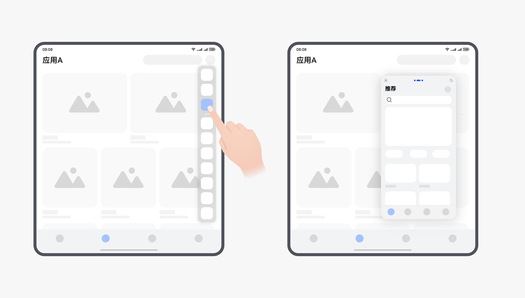 侧边条恢复:对于已开启悬浮窗模式的应用,其最小化后会暂存在屏幕上的侧边条中,点击或者长按侧边条可展开任务选择界面,选择点击侧边条中悬浮窗应用卡片时可恢复悬浮窗模式。