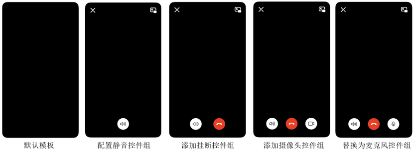 视频会议场景可通过配置VideoMeetingControlGroup来显示可选的控制层控件。示意图如下所示。若不配置,视频会议模版默认不存在任何按钮,点击画中画窗口即可启动还原(与视频通话模版操作示意图一致)。