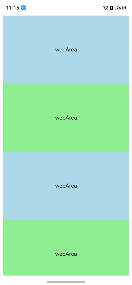 <!-- index.html --><!DOCTYPE html><html><head><meta name="viewport" id="viewport" content="width=device-width, initial-scale=1.0"><style>.blue {background-color: lightblue;}.green {background-color: lightgreen;}.blue, .green {font-size:16px;height:200px;text-align: center; /* 水平居中 */line-height: 200px; /* 垂直居中(值等于容器高度) */}</style></head><body><div class="blue" >webArea</div><div class="green">webArea</div><div class="blue">webArea</div><div class="green">webArea</div><div class="blue">webArea</div><div class="green">webArea</div><div class="blue">webArea</div><div class="green">webArea</div><div class="blue">webArea</div></body></html> -