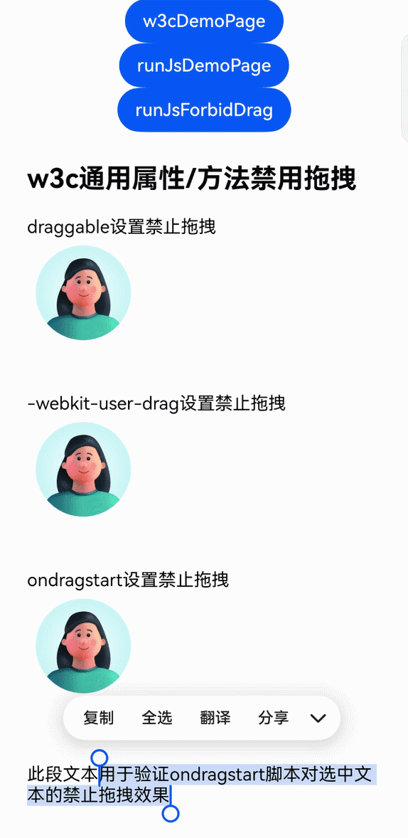 在未进行特殊配置的情况下,web组件默认支持拖拽功能。如果不需要拖拽功能,可以参考以下示例禁用拖拽。
