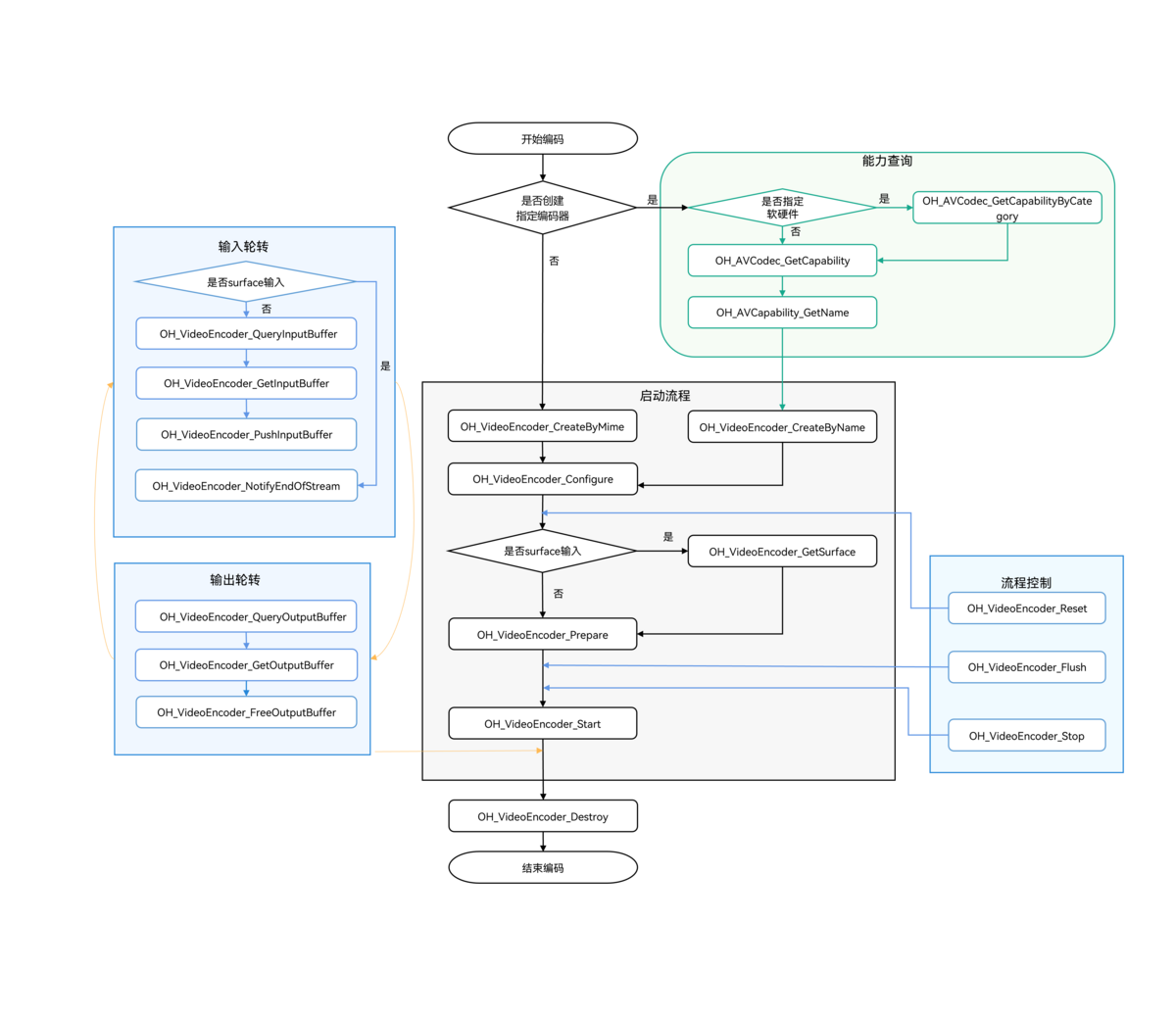 视频编码的限制约束、支持的能力、状态机调用关系请参考视频编码。