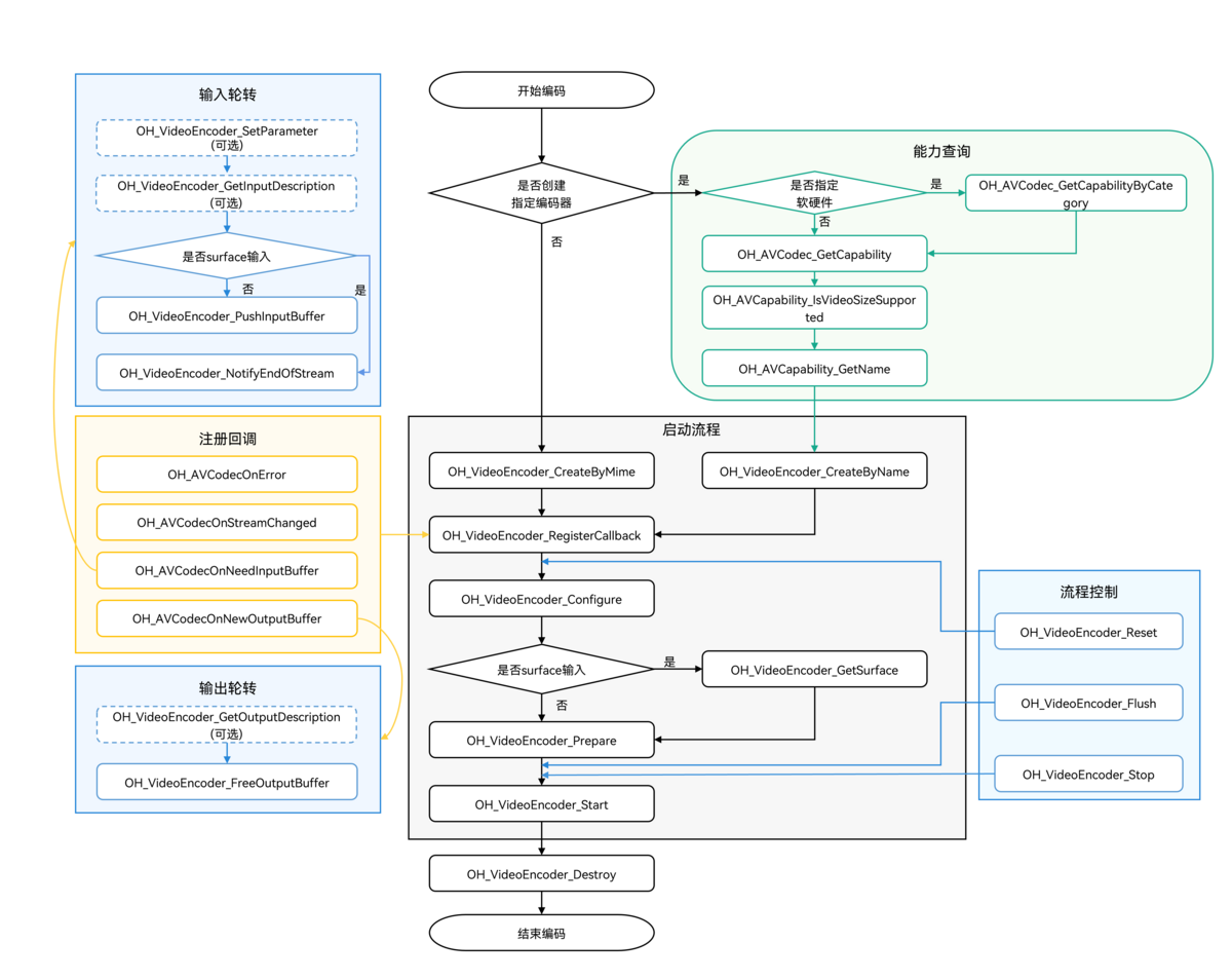 - Error状态下,可以调用OH_VideoEncoder_Reset接口将编码器移到Initialized状态;或者调用OH_VideoEncoder_Destroy接口移动到最后的Released状态。