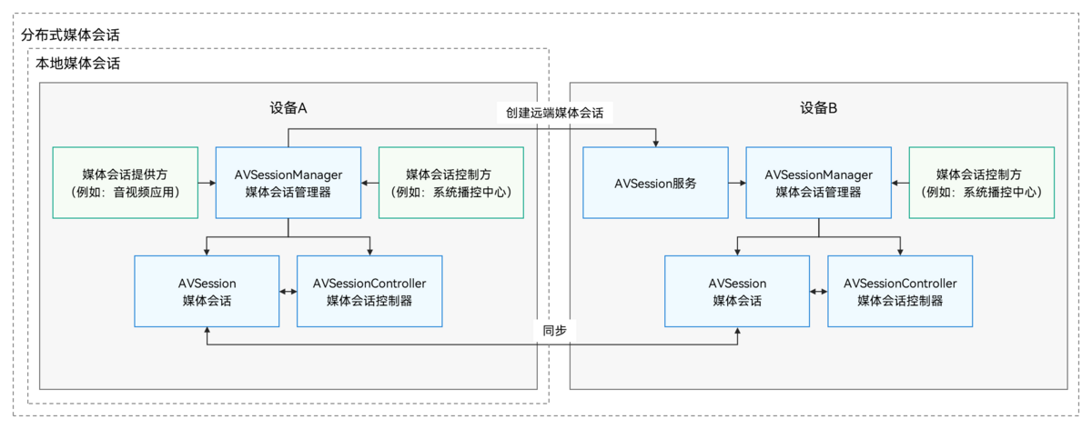分布式媒体会话在跨设备场景中的媒体会话提供方和媒体会话控制方之间建立连接,实现音视频应用跨设备的媒体播放控制和媒体信息显示。例如,将设备A中播放的内容投播到设备B,并在设备B中进行播放控制。