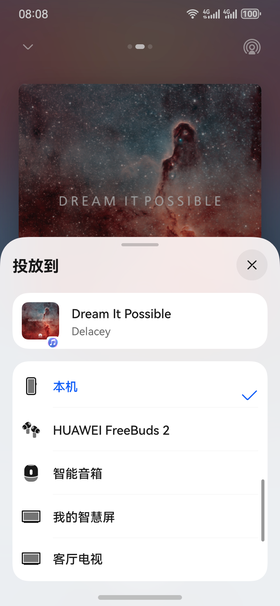 自验证关注点: 播放可投播的音视频资源,点击投播至3.1以上的华为智慧屏/DLNA协议的设备,查看投播功能是否正常可用,且在应用内及系统播控中心内能控制远端投播。