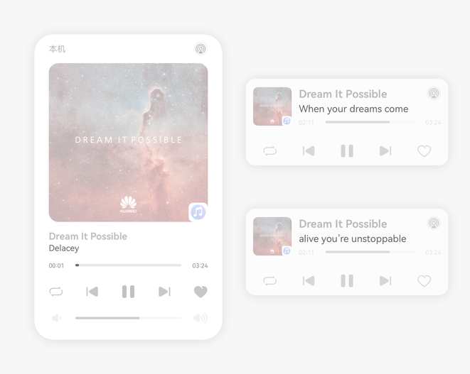 歌曲类媒体内容如有歌词信息,可以选择在副标题区域显示歌词。将当前播放歌曲的全曲歌词内容,按照标准lyric格式拼接为字符串,如[00:25.44]xxx\r\n[00:26.44]xxx\r\n,通过AVMetadata.lyric设置给播控中心。播控中心会自动按照进度,在副标题位置刷新显示,应用不需要实现其余功能。