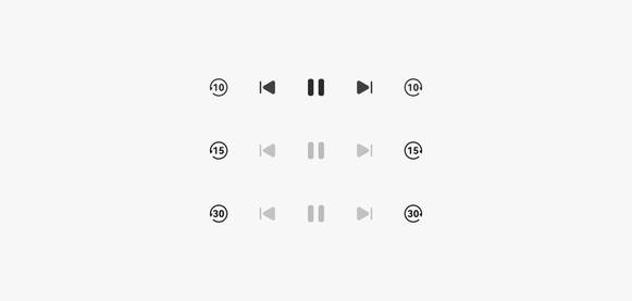 可选择快进快退的时间长度:10s、15s、30s。如下图显示。用户通过播控中心快进/快退,或在应用内快进快退,应用都需要通知播控当前调节完毕的状态与进度。