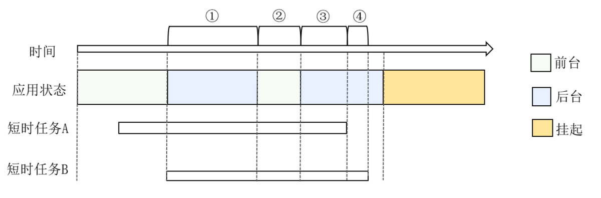 配额计算:仅当应用在后台时,对应用下的短时任务计时;同一个应用下的同一个时间段的短时任务,不重复计时。以下图为例:应用有两个短时任务A和B,在前台时申请短时任务A,应用退至后台后开始计时为①,应用进入前台②后不计时,再次进入后台③后开始计时,短时任务A结束后,由于阶段④仍然有短时任务B,所以该阶段继续计时。因此,在这个过程中,该应用短时任务总耗时为①+③+④。