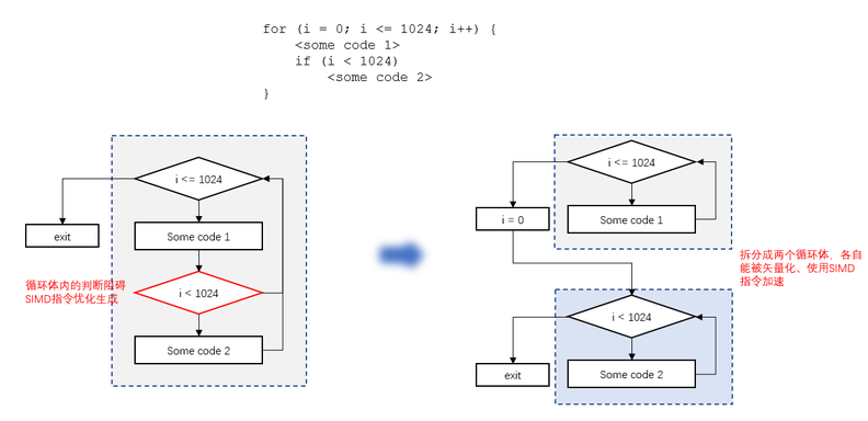 针对循环相关的编译优化,毕昇编译器在场景识别、结构变换等方面做了改进和增强。例如在社区LLVM已有的Loop Distribution优化上,毕昇编译器相比开源LLVM编译器,能额外识别出循环内不同代码块间数据依赖关系、以及不同代码块运行的迭代次数差别,从而能对更多的循环进行loop distribution优化。