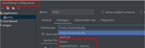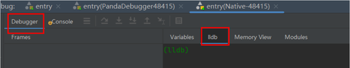 启动后会出现debug窗口,确保是Native的debug模式,未出现则需要修改Deveco的debug Type配置为Native。