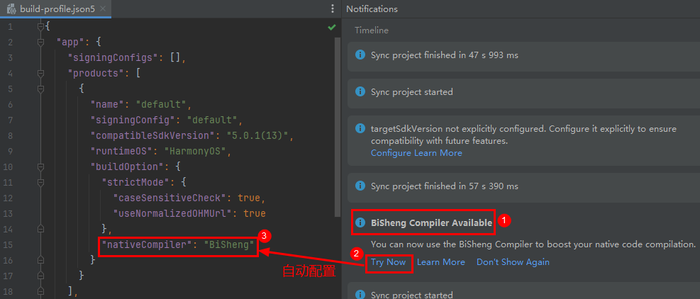 - 开发者获取或在线升级到DevEco Studio 5.1.1 release及之后的版本,新建C/C++工程默认使用毕昇编译器,打开C/C++老工程有弹窗提示,点击Try Now可以切换使用毕昇编译器,构建HarmonyOS工程的C/C++代码。