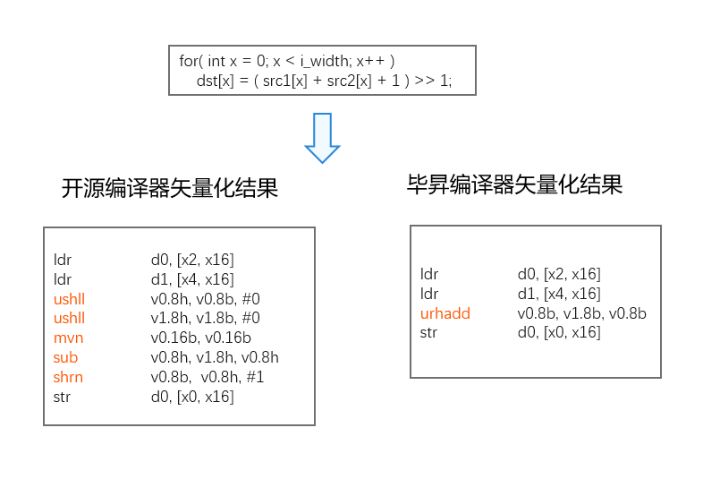 毕昇编译器在矢量化优化方面,相比开源LLVM编译器,不仅能将更多的循环做矢量化转换,还在矢量化指令选择上更高效。例如下面示例中,开源LLVM编译器虽然做了矢量化,但使用了5条矢量指令;而毕昇编译器只需要使用2条矢量指令,最终产生的二进制效率更优。