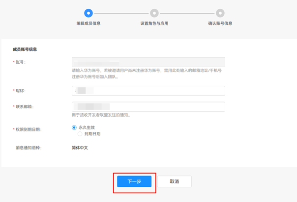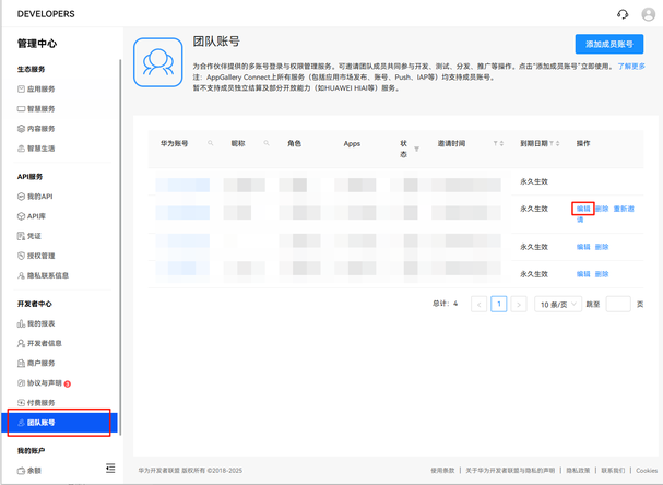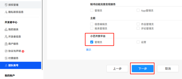 进入开发者管理中心,登录企业账号(暂不支持个人开发者)。企业主账号无需手动添加权限;若使用团队成员账号,请确保使用企业主账号为其添加“小艺开放平台”的管理员权限,具体添加可见下图。
