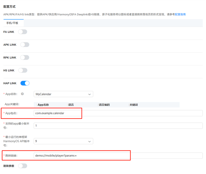 - 勾选一键服务之后,选择服务类型(请与Calendar Kit提供的日程服务类型ServiceType一致),点击添加关联按钮,输入app包名及app名称(请确保app包名及app名称准确匹配,否则一键服务无法生效)。