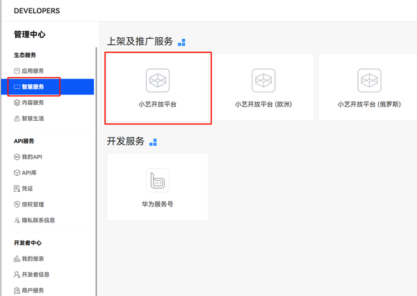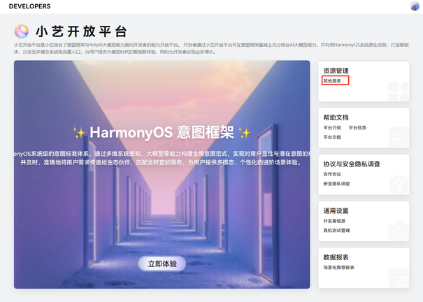 登录成功后,在侧边栏菜单中生态服务下选择智慧服务,点击进入小艺开放平台。