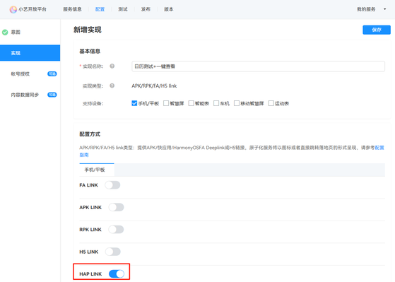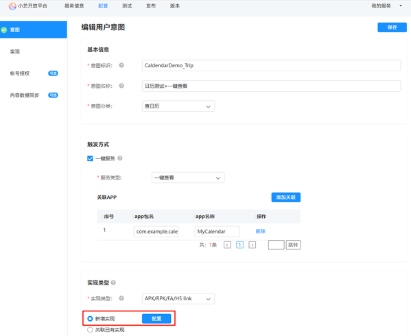 配置意图的实现类型,选择APK/RPK/FA/H5 link,选择新增实现,点击配置按钮。