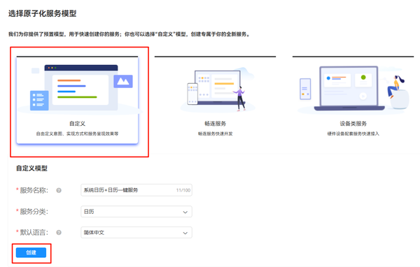 选择自定义模型,填写服务名称、服务分类、默认语言,点击创建按钮。