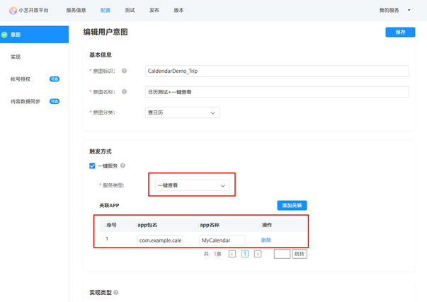 - 设置意图标识、意图名称和意图分类,勾选一键服务。意图分类选择“查日历”。