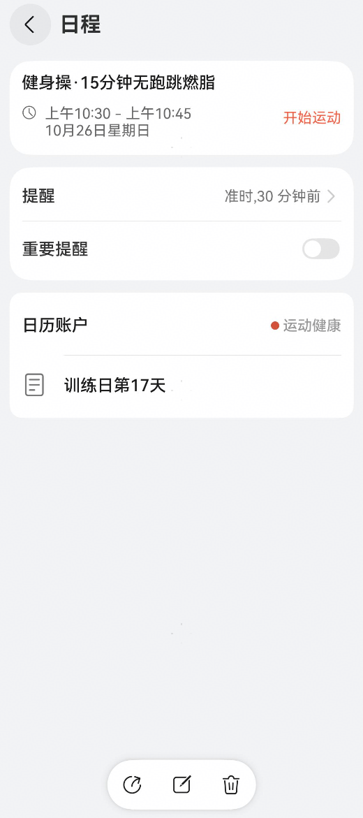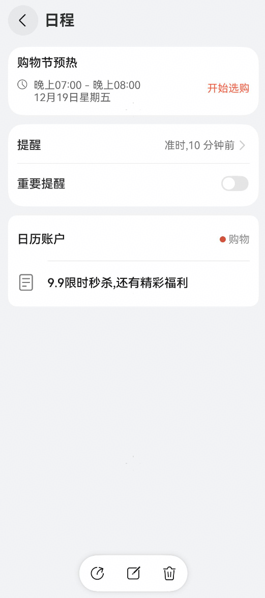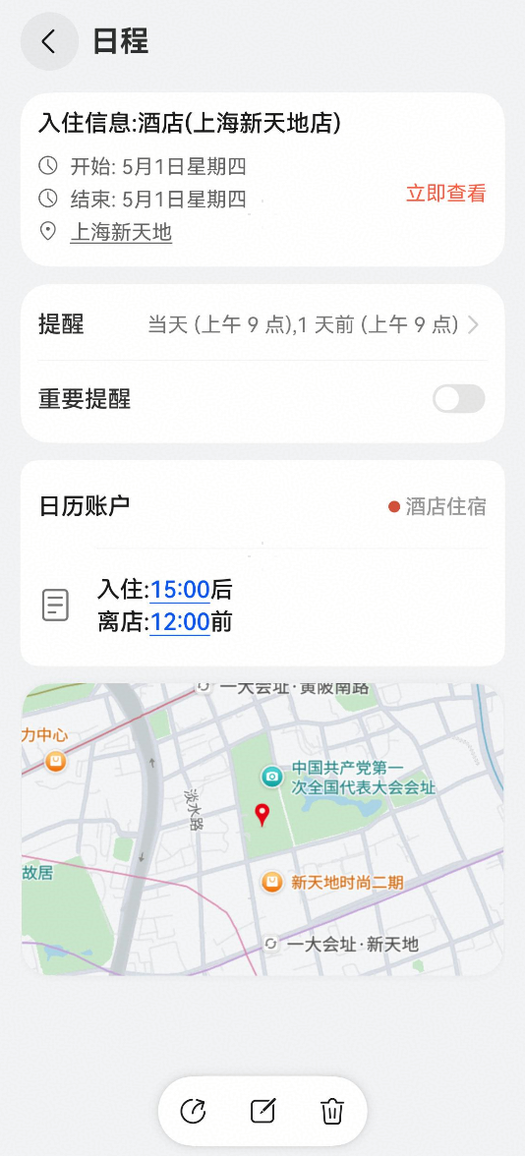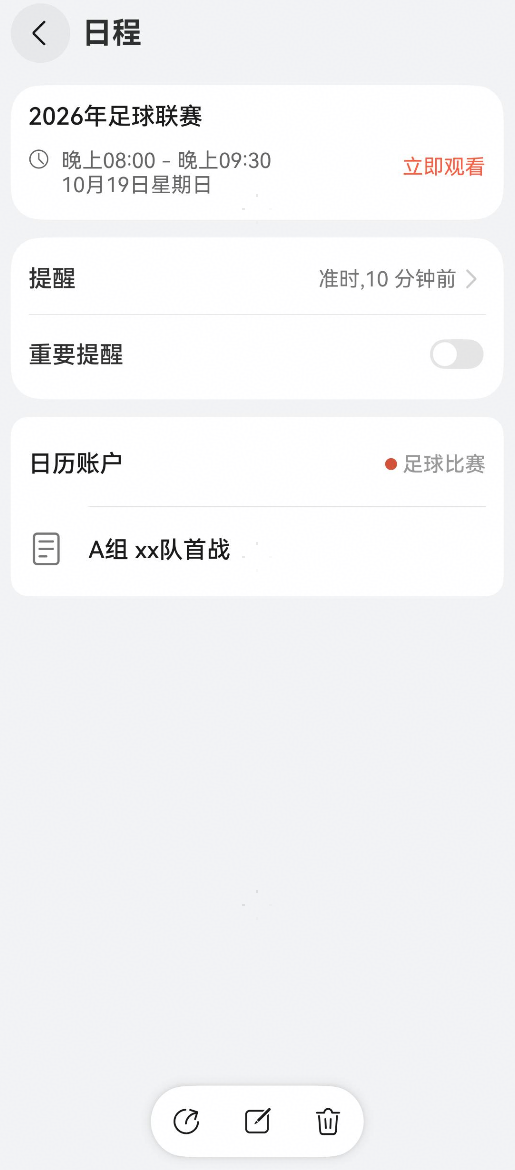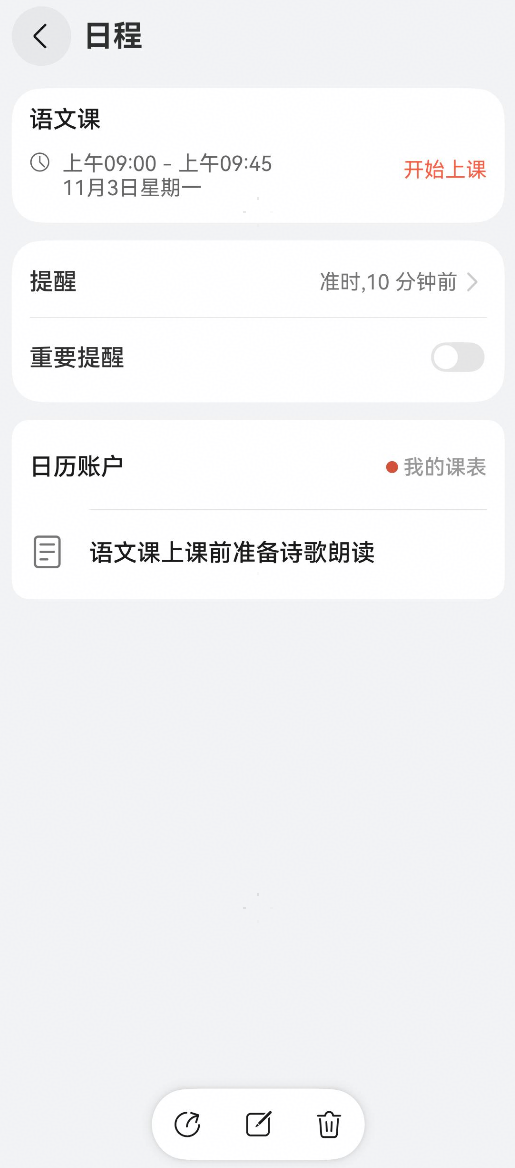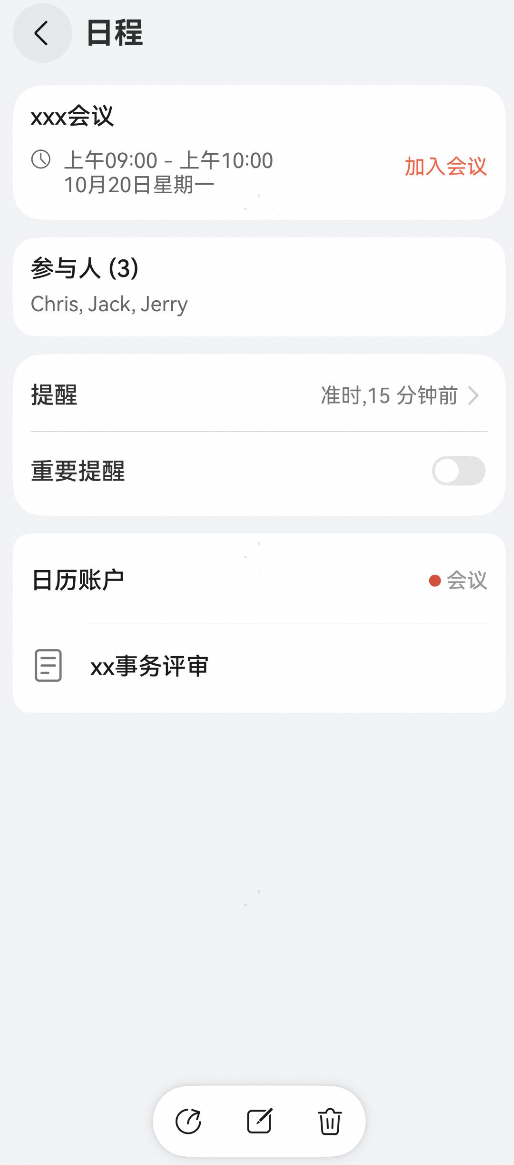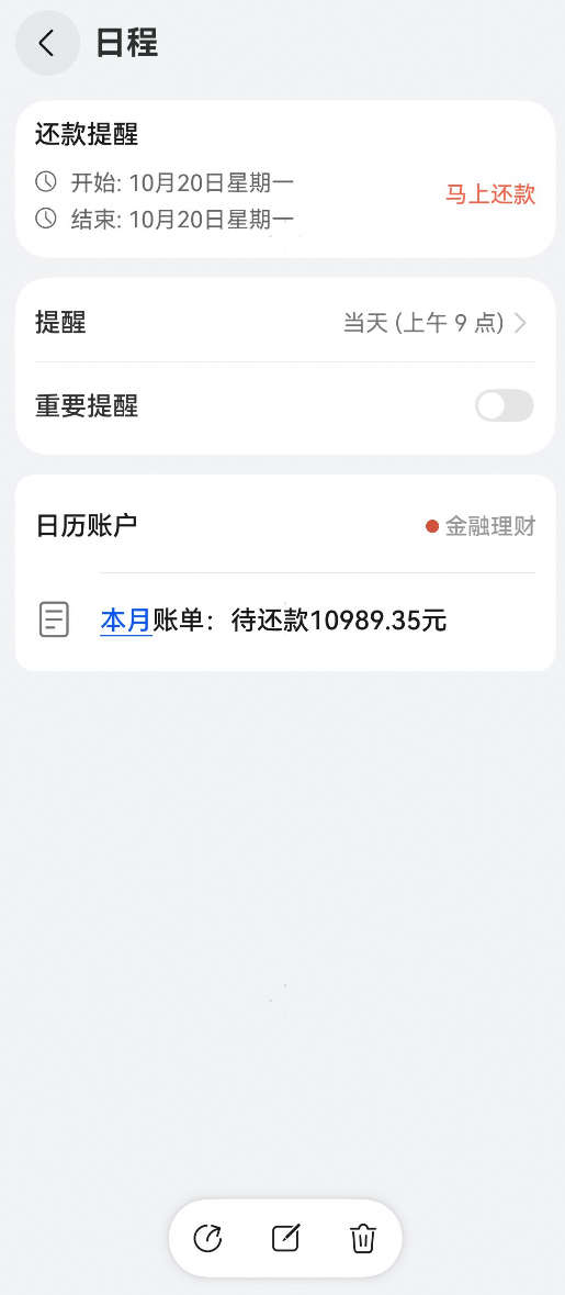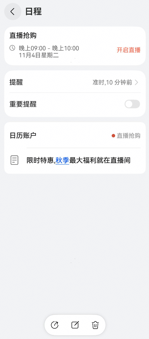- 日程通知:通知弹出时显示,通知中心内点击对应日程卡片后显示。