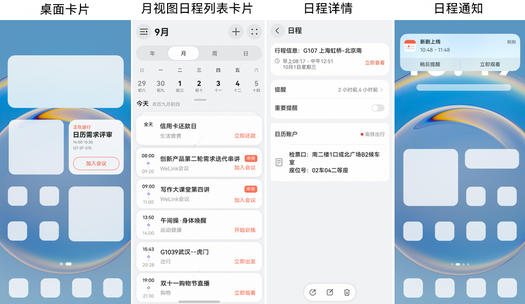 写入日历的日程可通过通知中心、桌面卡片以及日历应用内部等多种入口向用户展示。