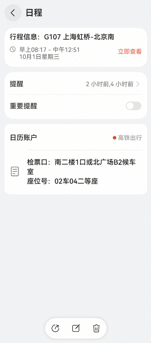 当用户通过购票平台预订火车票、机票或其他交通方式后,系统可以自动将其行程信息添加至日历,并在适当的时间节点进行提醒。