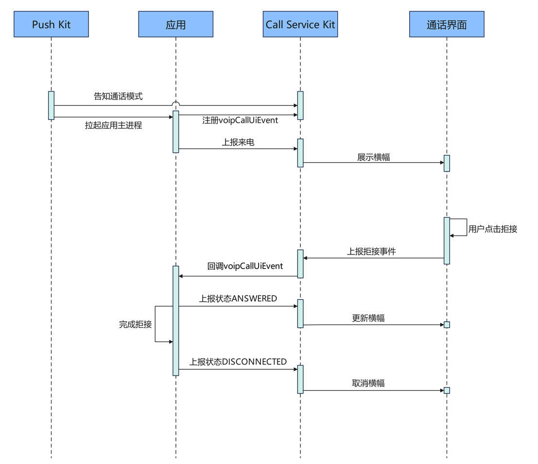 voipCall.on('voipCallUiEvent', callback => {if (callback?.voipCallUiEvent == voipCall.VoipCallUiEvent.VOIP_CALL_EVENT_VOICE_ANSWER) {//...在应用内完成接听// 应用内接听后,向Call Service Kit上报通话状态voipCall.reportCallStateChange(callback.callId, voipCall.VoipCallState.VOIP_CALL_STATE_ACTIVE);}});如果用户在横幅通知上点击拒接,则应用在接收到VOIP_CALL_EVENT_REJECT事件回调之后,在应用内完成拒接,然后向Call Service Kit 上报VOIP_CALL_STATE_DISCONNECTED状态,系统会取消横幅通知。