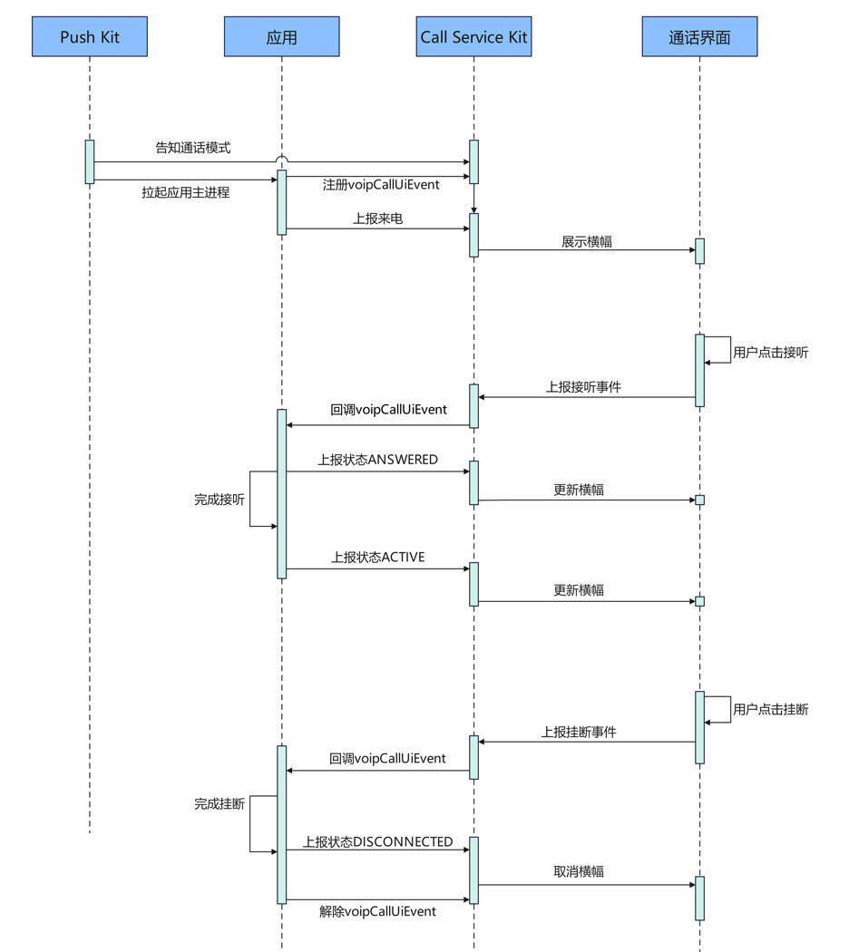一直到完成应用内接听后,再向Call Service Kit上报VOIP_CALL_STATE_ACTIVE状态。