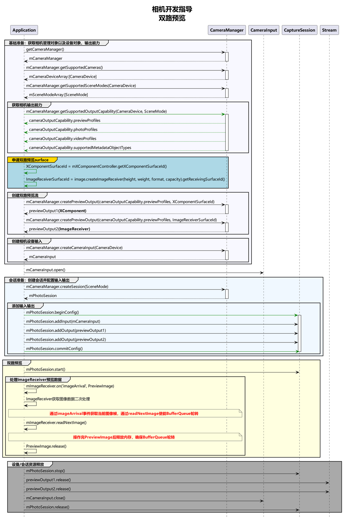 如果要实现双路预览,可以先参考拍照,在双路预览中将拍照流改为另一路预览流,通过ImageReceiver的Surface创建另一个previewOutput,其余流程与拍照一致。