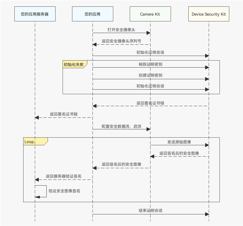 当前文档主要说明通过Camera Kit完成的步骤,证明会话相关步骤需通过Device Security Kit完成,具体可参考可信应用服务-安全摄像头。