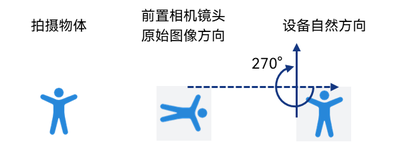 而手机前置镜头,是朝向使用者的,当手机在竖屏方向使用前置相机镜头拍摄时,出图方向与后置出图方向互为镜像,如下图所示,前置相机的镜头角度为270度。