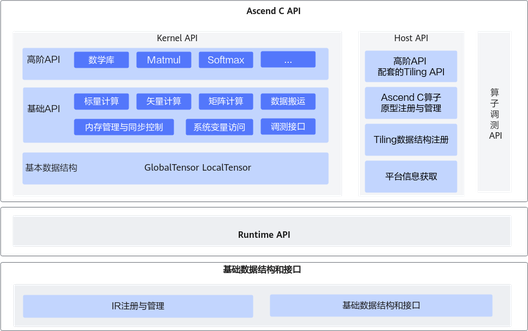 - 高阶API: 实现一些常用的计算算法,用于提高编程开发效率,通常会调用多种基础API实现。高阶API包括数学库、Matmul、Softmax等API。高阶API可以保证兼容性。