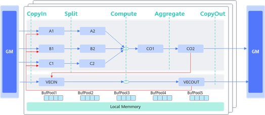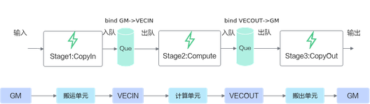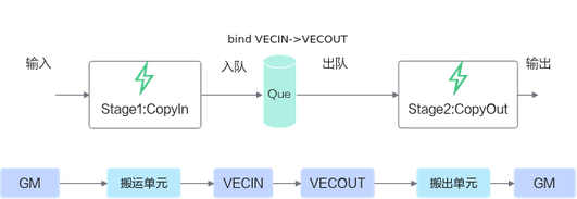 如下的编程范式示例,图中的两个队列分别绑定的是GM VECIN和VECOUT GM。