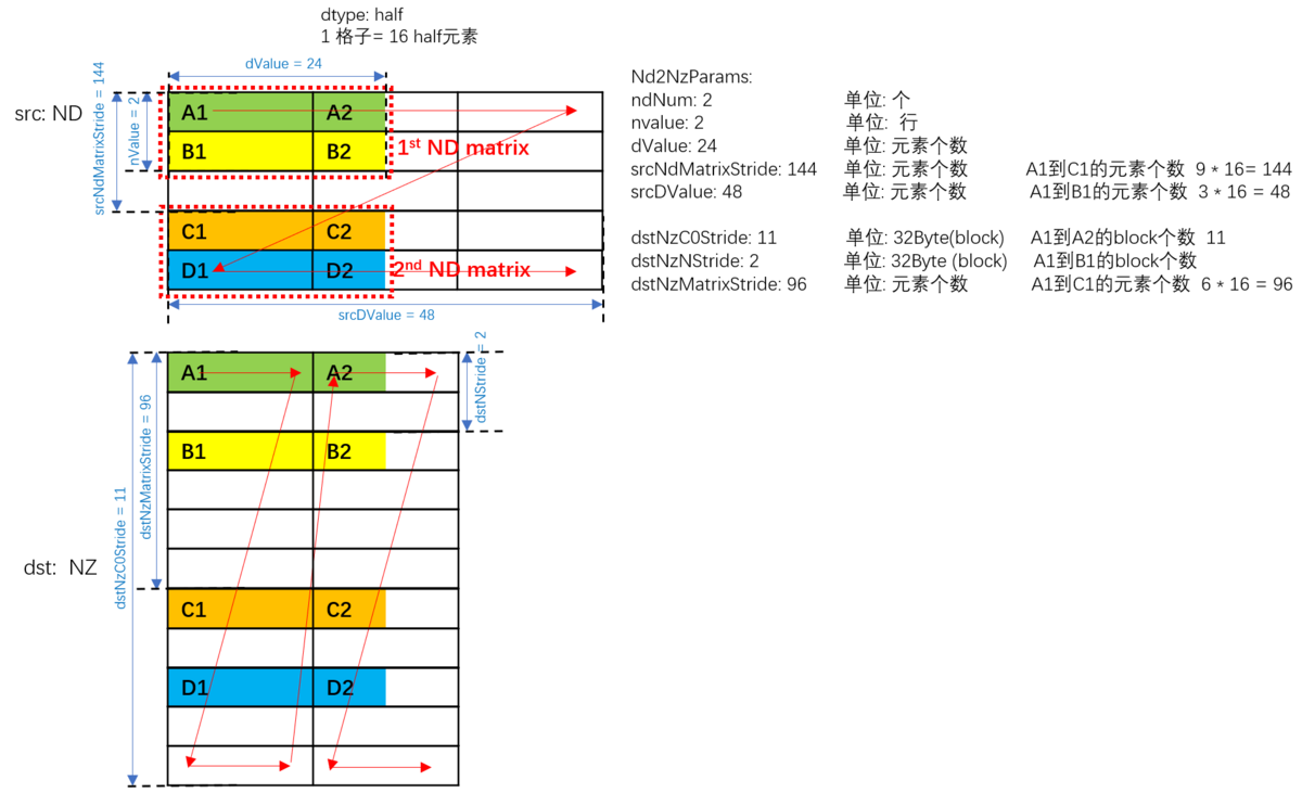 - dstNzNStride = 2,表达dst中一个ndMatrix, src的第x行和第x+1行之间的偏移,即A1和B1之间的距离,即为2个datablock。