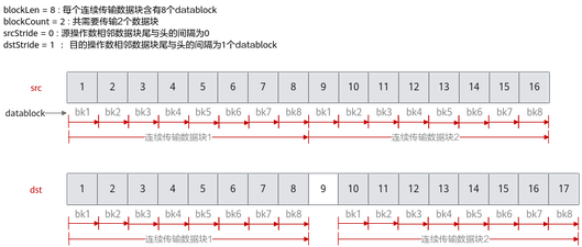 下面的样例呈现了DataCopyParams结构体参数的使用方法,样例中完成了2个连续传输数据块的搬运,每个数据块含有8个datablock,源操作数相邻数据块之间无间隔,目的操作数相邻数据块尾与头之间间隔1个datablock。