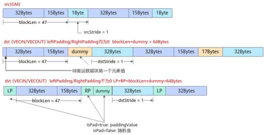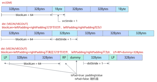 blockLen+leftPadding+rightPadding不满足32字节对齐时,框架会填充一些假数据dummy,保证左右填充的数据和blockLen、假数据为32字节对齐。leftPadding/rightPadding不为0:若isPad为false,左右两侧填充的数据值和dummy值均为随机值,否则为paddingValue。