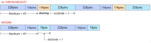 blockLen为47,每个连续传输数据块包含47Bytes;srcStride为1,表示源操作数相邻数据块之间间隔1Byte;dstStride为1,表示目的操作数相邻数据块之间间隔1个dataBlock。
