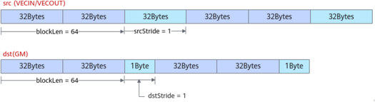 - srcStride为源操作数相邻连续数据块的间隔(前面一个数据块的尾与后面数据块的头的间隔),源操作数逻辑位置为VECIN/VECOUT,其单位为datablock, 两个连续传输数据块(A1