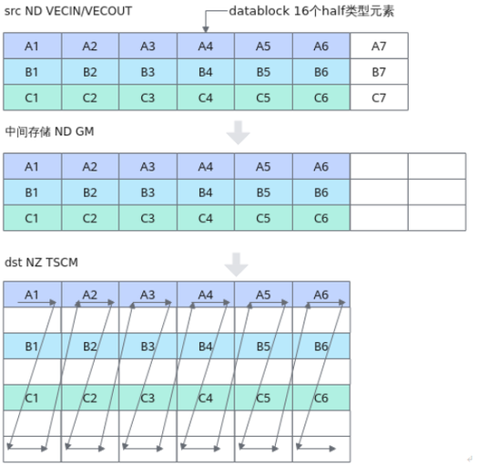 如下图所示,展示了从VECIN/VECOUT搬运到GM,再搬运到TSCM的过程:示例中数据类型为half,单个datablock(32B)含有16个half元素,源操作数中的 A1