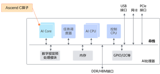 如下展示了总体的硬件基本架构。其中,AI Core通过数据总线与硬件结构中其它基本单元相连接,基于AscendC开发的算子,通过总线传输并最终运行在AI Core上。下文的编程模型基于硬件架构的抽象进行介绍,了解该内容能够更好的理解编程模型;对于需要完成高性能编程的深度开发者,更需要了解硬件架构相关知识,最佳实践中很多内容都以本章为基础进行介绍。