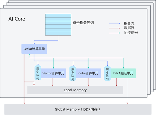 - AI Core内部的异步并行计算过程:Scalar计算单元读取指令序列,并把向量计算、矩阵计算、数据搬运指令发射给对应单元的指令队列,向量计算单元、矩阵计算单元、数据搬运单元异步的并行执行接收到的指令。该过程可以参考图1中蓝色箭头所示的指令流。