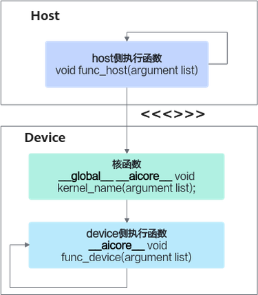 图1 核函数(device侧执行)、host侧执行函数、device侧执行函数(除核函数之外的)调用关系