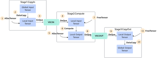 - CopyIn负责搬入操作:将输入数据从Global Memory搬运到Local Memory(VECIN用于表达矢量计算搬入数据的存放位置),完成搬运后执行入队列操作。