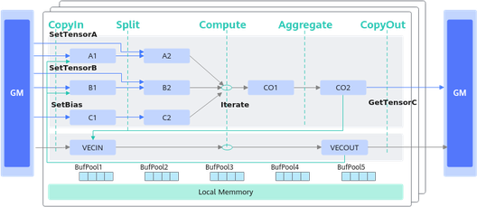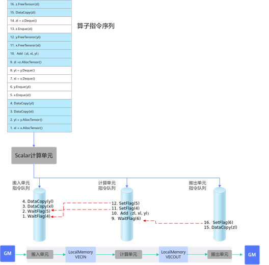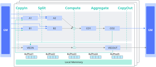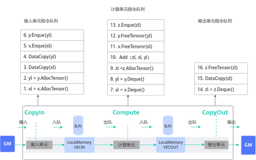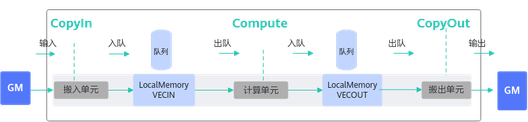 - Compute负责矢量指令计算操作:完成队列出队后,从Local Memory获取数据并计算,计算完成后执行入队操作。