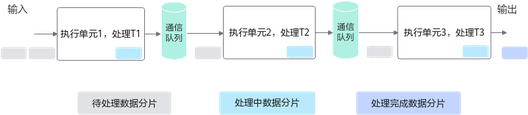 根据硬件架构抽象可以了解到,AI Core内部的执行单元异步并行地执行接收到的指令。如下图所示,从输入数据到输出数据需要经过3个阶段任务的处理(T1、T2、T3),多个执行单元并行处理,每个执行单元只会专注于一个任务的处理,会处理所有的数据分片。可以看出,流水线并行和工业生产中的流水线是类似的,每一个执行单元都可以看成是流水线上的节点,通过流水线并行的方式来提高计算效率:执行单元1完成对某个数据分片的处理后,将其加入到通信队列,执行单元2空闲时就会从队列中取出数据继续处理;可以类比为生产流水线中的工人只完成某一项固定工序,完成后就交由下一项工序负责人继续处理。