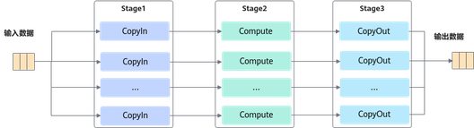 按照上述编程范式进行编程即可实现单核上数据的并行处理。需要处理的数据被切分成n片,每个并行任务(Stage1、2、3)需要依次完成n个数据切片的处理。Stage间的箭头表达数据间的依赖关系,比如Stage1(CopyIn)处理完第一个数据分片之后,Stage2(Compute)才能对该分片进行处理。