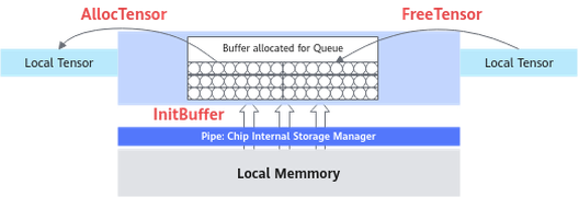 任务间数据传递使用到的内存、事件等资源统一由管理模块Pipe进行管理。如下所示的内存管理示意图,TPipe通过InitBuffer接口对外提供Queue内存初始化功能,开发者可以通过该接口为指定的Queue分配内存。