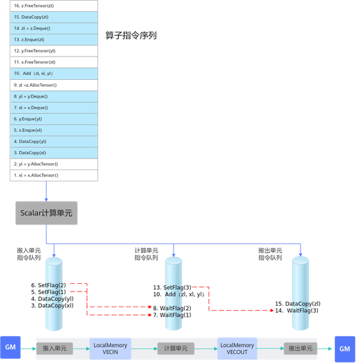 以最简单的矢量编程范式为例,在调用上述接口时,实际上会给各执行单元下发一些指令,如下图所示: