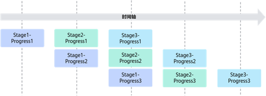 上图中的流水任务运行起来的示意图如下,Progress1、2、3代表处理的数据分片,从运行图中可以看出,对于同一片数据,Stage1、Stage2、Stage3之间的处理具有依赖关系,需要串行处理。不同的数据切片,同一时间点,可以有多个任务在并行处理,由此达到任务并行、提升性能的目的。