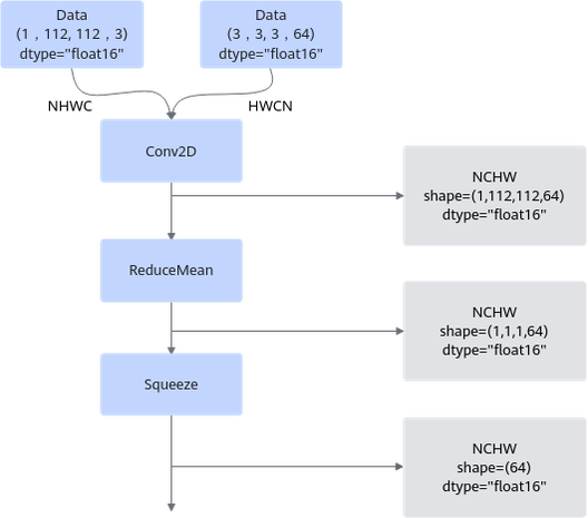 下面的网络模型经过shape和datatype推导之后,可以得到灰色底纹框中的推导信息。